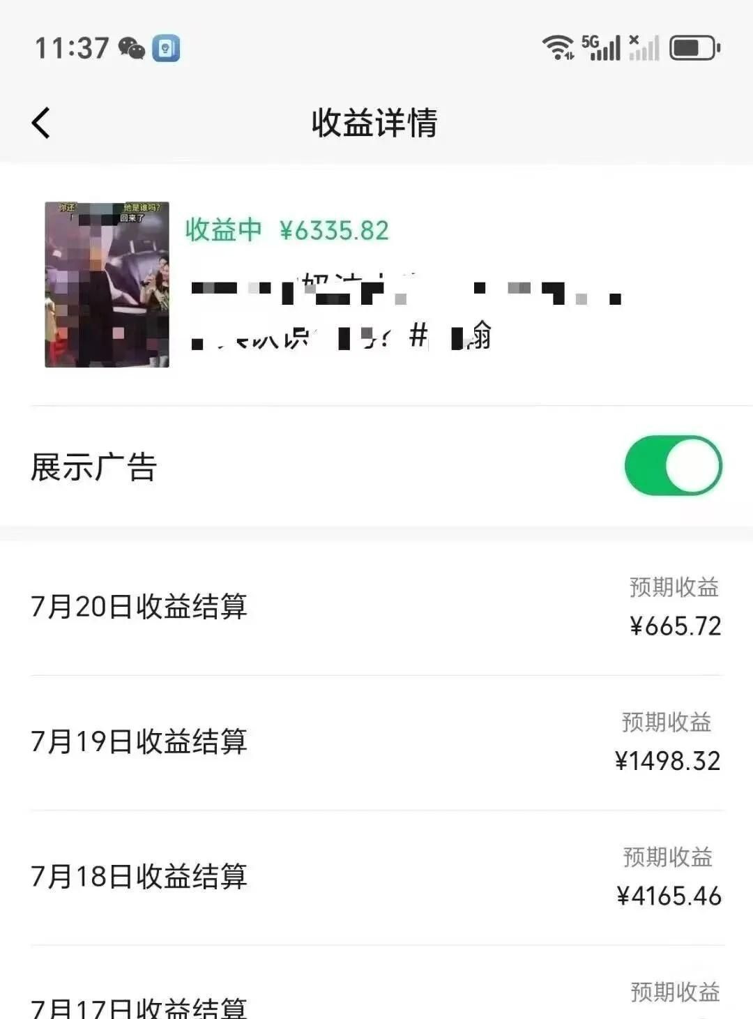 有人在视频号发布一条视频,四天就获得了6335元收益,且该视频流量尚未完全结束,第五天仍有数百元的尾流收入。