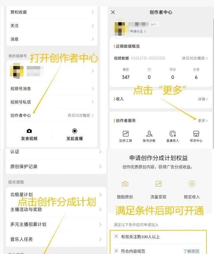 进入视频号后,点击“创作者中心”,在服务板块点击“更多”,下拉找到“创作分成计划”