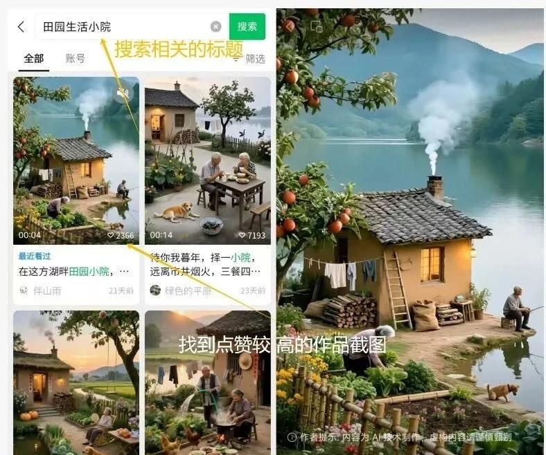 打开视频号,搜索“田园生活 小院 日常”,找到点赞数千以上的作品,截图保存。