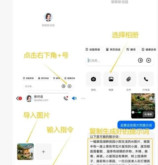 打开“豆包AI”,点击右下角加号,选择相册并导入刚才的截图,输入“反推这张图的提示词”,AI会自动生成关键词,直接复制备用即可。
