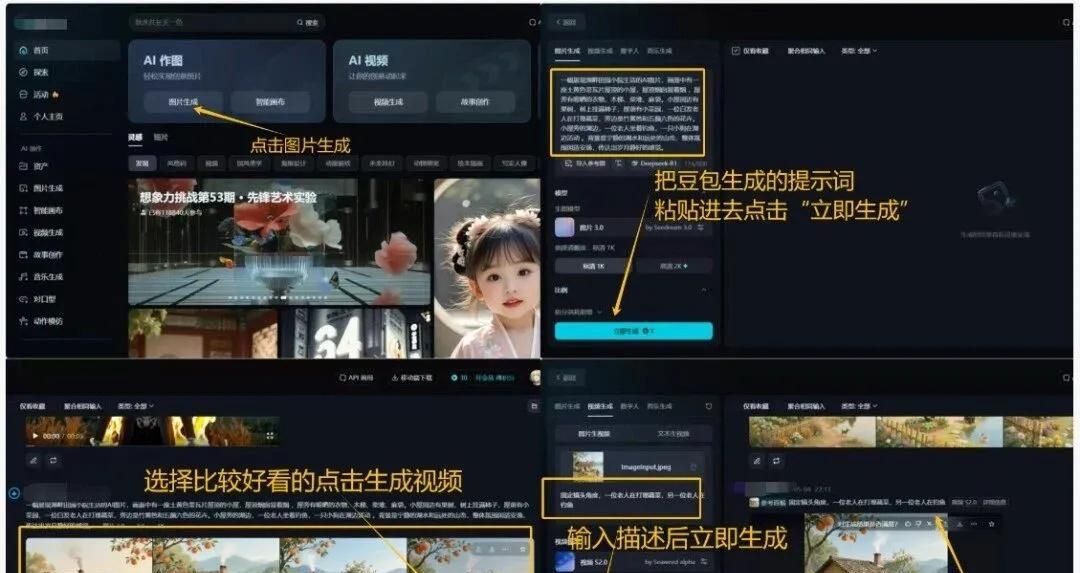 打开“AI软件”,进入“图片生成”功能,粘贴提示词并设置比例为9:16。AI会生成四张图片,选择最满意的一张点击“生成视频”,输入一句简单描述,视频即可生成,下载保存即可。
