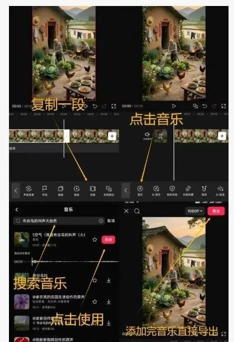 AI生成的视频通常较短,可在剪映中复制多段拼接以增加时长,再搭配田园风格的纯音乐,一条治愈系视频就完成了。