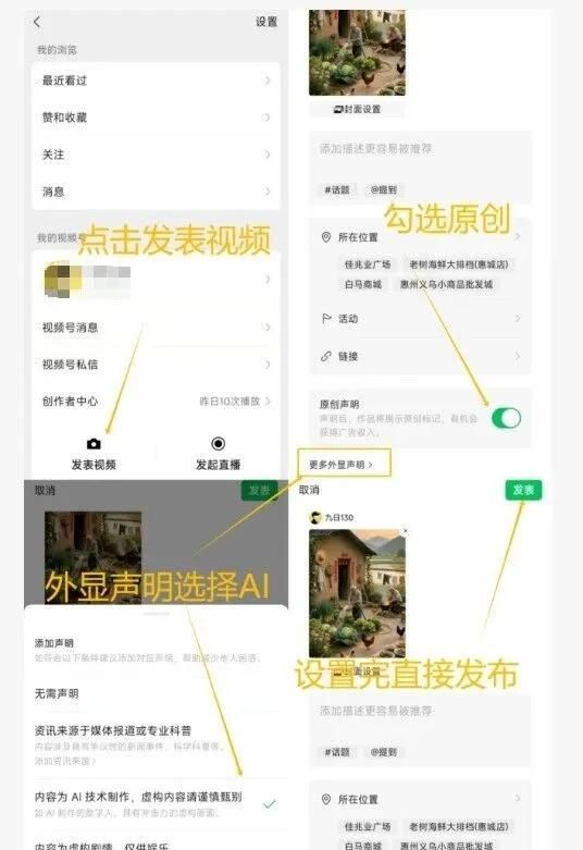 回到视频号,点击“发表视频”,导入刚才剪辑好的作品,务必勾选“原创声明”,外显声明选择“AI技术制作”,最后点击发布即可完成。