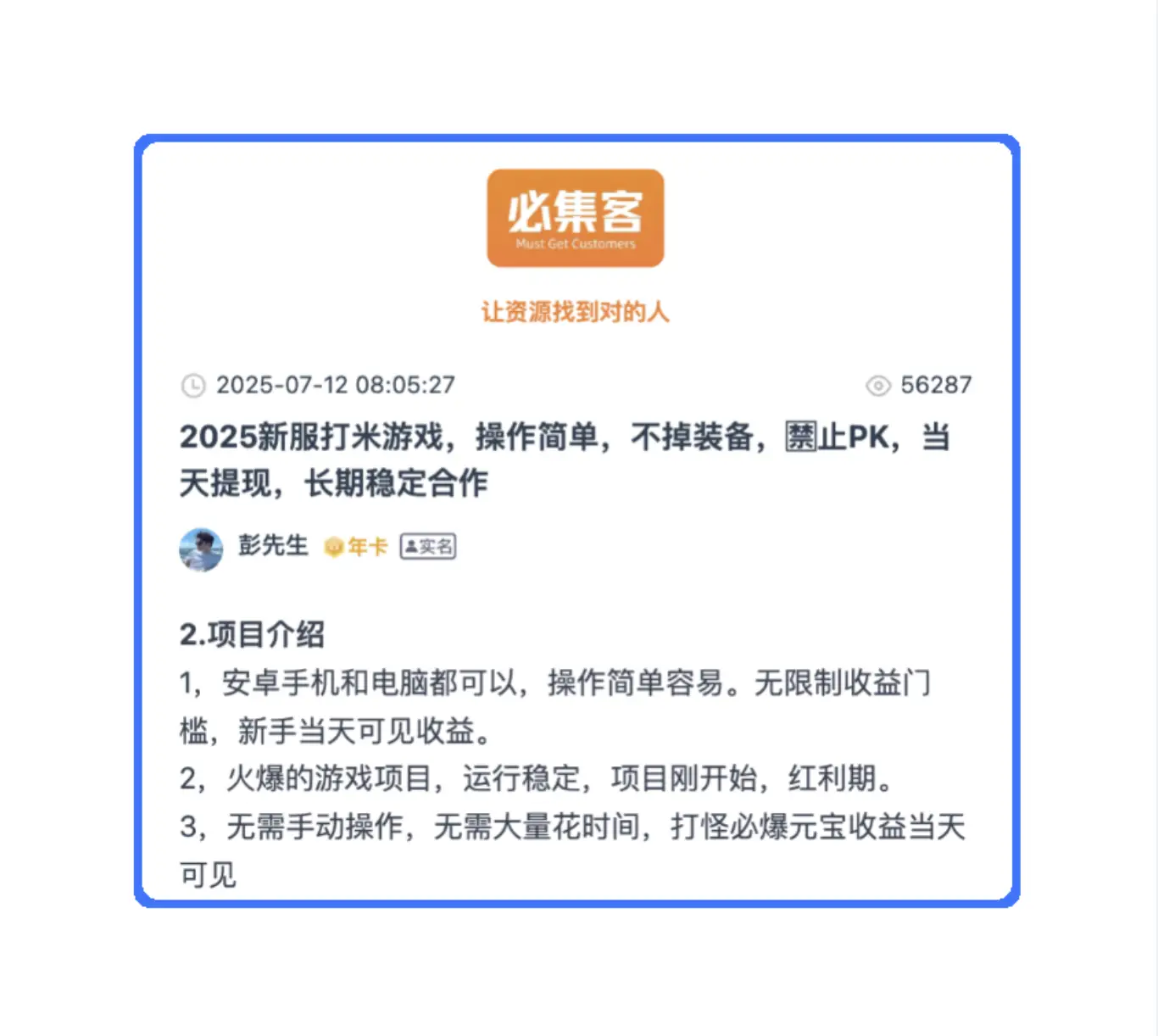 我们可以借助必集客平台——国内领先的游戏搬砖工作室招商平台,从上面发布的招商信息和资源动态中“窥一斑而知全豹”,判断出哪些游戏真正值得投入。