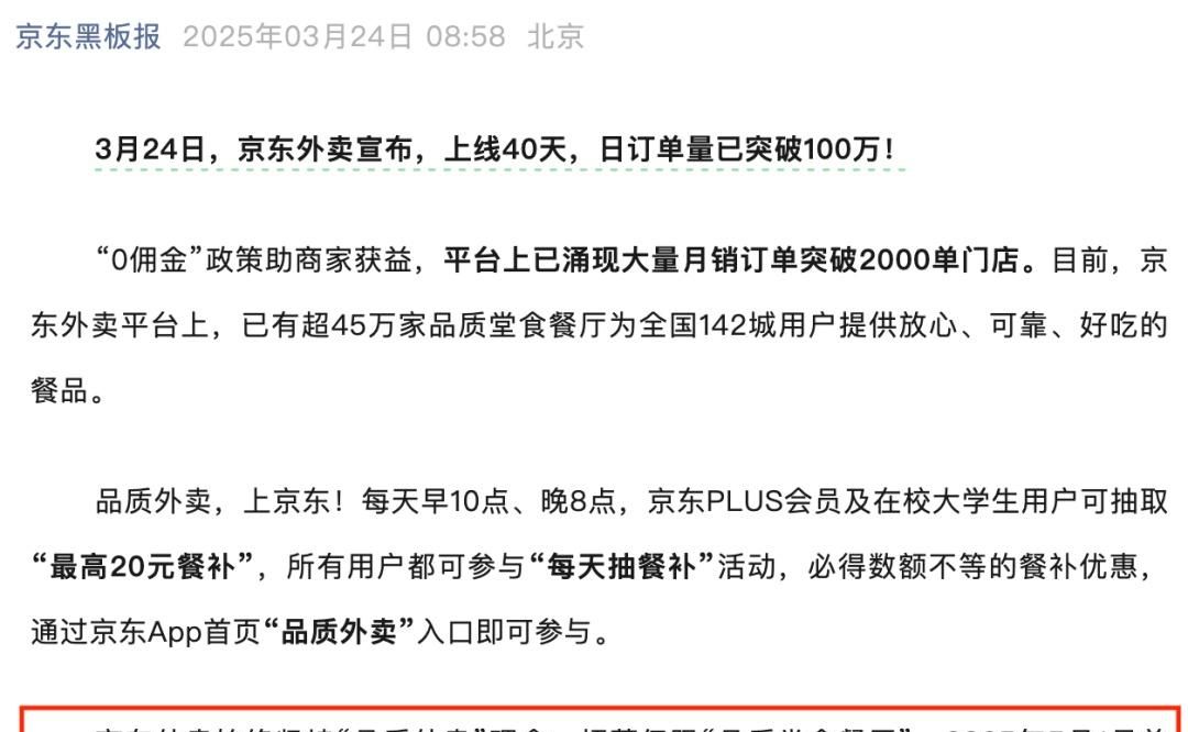 凭借0佣金政策引爆商家入驻热潮,上线仅40天的京东外卖,日订单量已成功突破100万单!