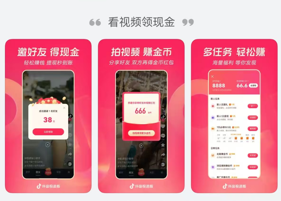 抖音极速版的变现门槛特别低,不用任何粉丝基础,也不用拍视频,只要刷视频就能变现。