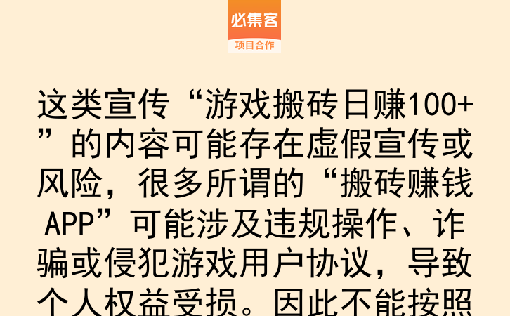 作为热门的赚钱app软件,必集客的核心优势在于海量游戏搬砖项目储备。不管你偏好手动操作还是托管挂机,都能找到匹配的玩法,平台还将项目划分为资源产出、市场交易等不同类型,你可以根据每日可投入时间自由选择,无需局限于单一模式。新手入门可从材料收集类项目开始,每天投入3小时完成固定任务,单日收益稳定在80-150元;若时间充裕,尝试多开账号操作或跨区套利类项目,月入3000+的目标不难达成。平台项目信息完全透明,每项任务都会明确标注要求与收益范围,让你的每一份付出都有清晰回报。必集客是一个项目资源对接平台,提供副业项目和合作资源,适合找合作、拓业务的朋友。