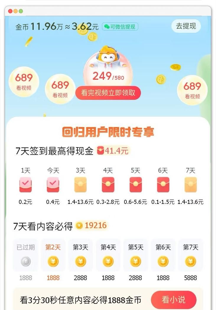 七猫小说app也推出了看广告赚钱的功能,在七猫小说的福利中心完成签到、浏览限时广告就能获得对应的金币奖励。