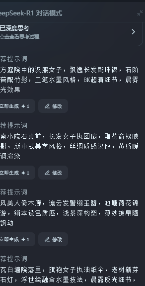 现在即梦AI还接入了DeepSeek-R1大模型,操作起来更简单,它能基于你的需求帮你优化描述,生成更符合预期的图片。