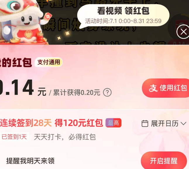 支付宝和美团一样,也上线了视频内容,还把它放在了首页显眼的C位。我们点进去看视频时,红包转完一圈,给到的不是金币,直接就是现金奖励。