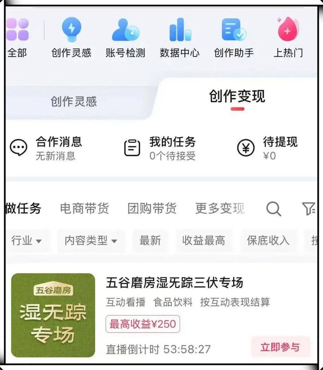 在抖音创作者中心的“创作变现”板块里,聚集着各式各样的赚钱任务,比如视频任务、看播任务、互动任务等等。