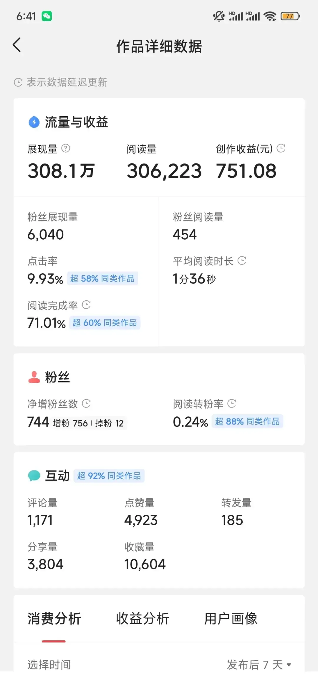 他发布的第一条视频意外获得了30万+播放量、185次转发,内容仅是分享了小学课本中李清照的古诗词《如梦令》,除此之外几乎未做其他额外操作,便赚取了750多元,收益相当不错。