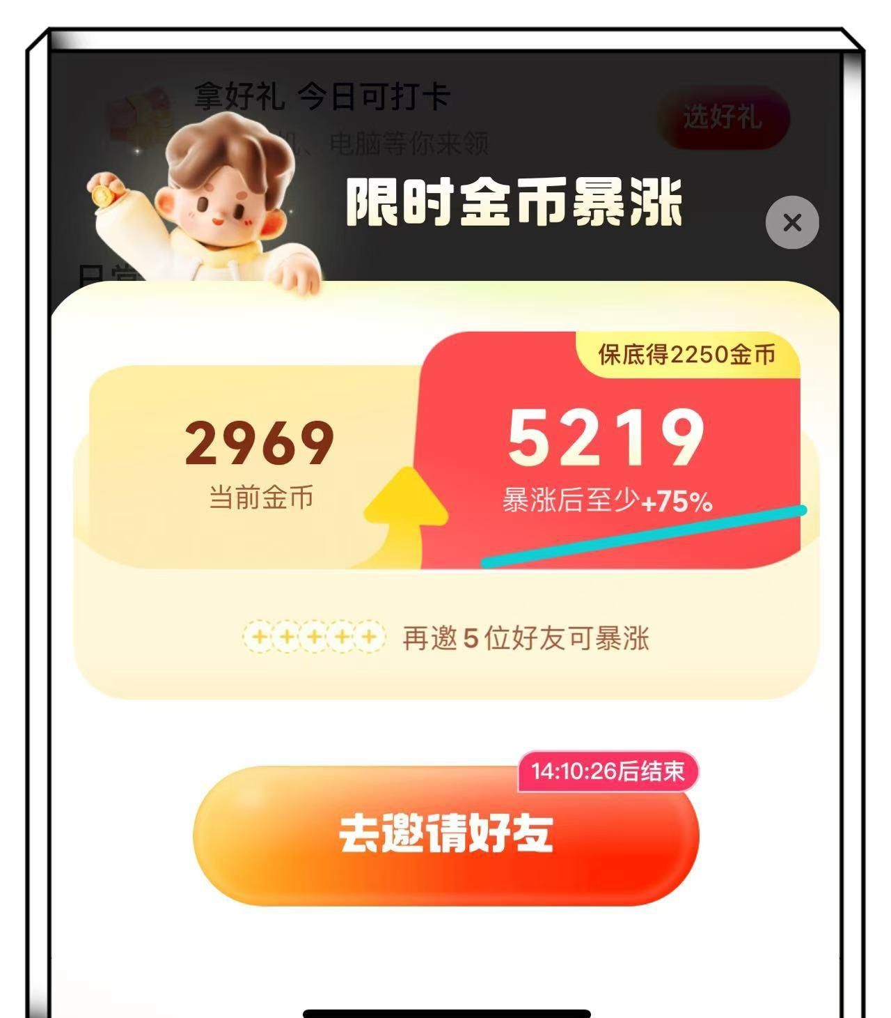 进入“金币暴涨”页面后你会发现,只需要按照要求邀请5位好友,就能获得暴涨金币,保底也有2250金币。用这个方法操作,能让你的金币收益瞬间提升1倍,这么好的事何乐而不为呢?