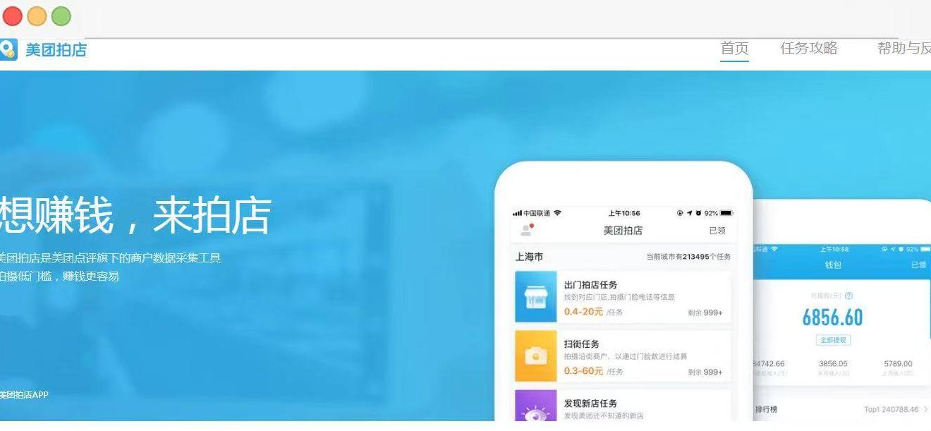 美团拍店是一款数据采集软件,简单来说,就是按任务要求用手机拍摄商铺照片并上传,单价基本在4-12元左右,积少成多。比如我家附近美食街上的奶茶店、便利店,差不多每周都能刷出新任务,平时逛街遛弯时就能把钱赚了。