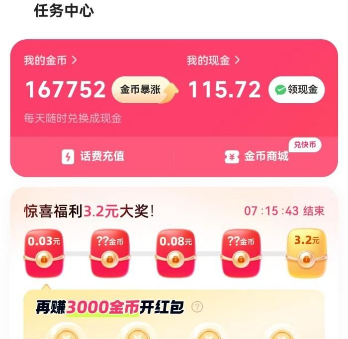 通过完成任务中心的各类赚金币任务,用户可获得相应数量的金币,其中签到、看视频、看广告、开宝箱、看直播是获取金币的主要途径。每10000金币可兑换1元现金收益,累计收益达到提现门槛后即可提现。
