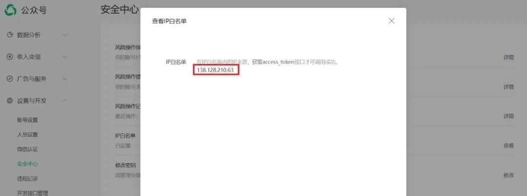 打开公众号后台,依次点击【设置与开发】-【安全中心】