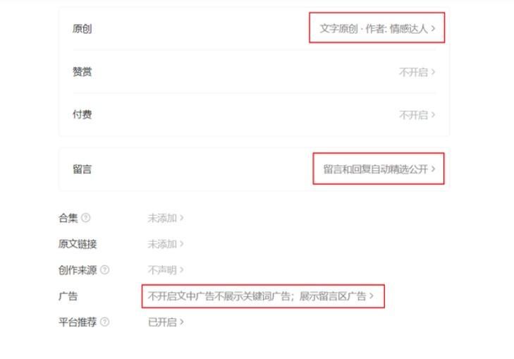 你只需要拉到文章底部,开启原创声明、开启留言功能、开启底部广告。