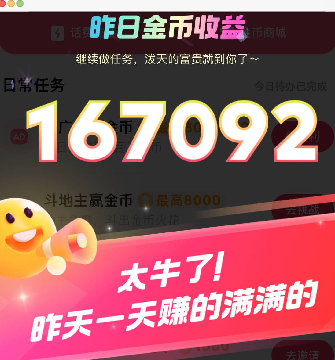 快手极速版的主要任务是“看广告得金币”,如果账号主要定向“电商广告”和“游戏广告”,就能稳定获得10万左右的金币。