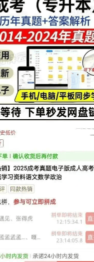 咱们就拿今天要拆解的真实案例来说:有人靠卖专升本资料和四六级英语资料,客单价仅2.9元和7.9元,累计卖出2.6万份,纯利润就赚了9万!你猜猜成本多少?在拼多多上,同款资料的拿货价才5毛钱!而且资料存在网盘里,后续可以无限次重复销售,边际成本几乎为零。
