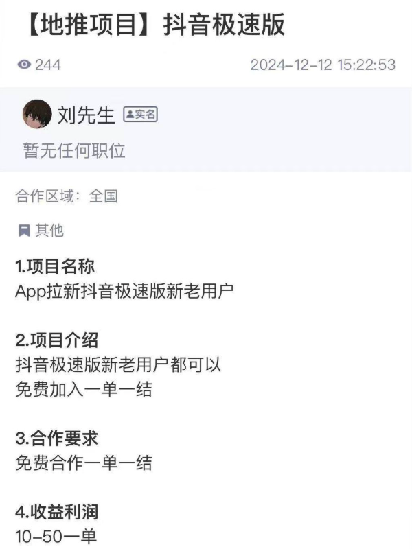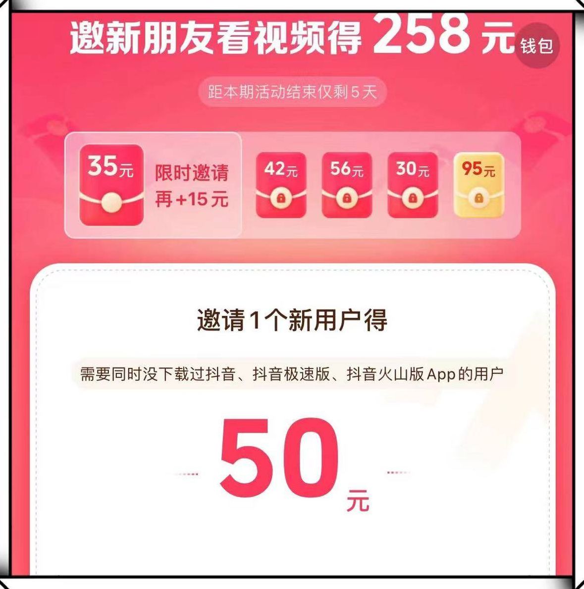 它和平台“邀请好友得现金”活动的本质是一样的,根据必集客、集客圈、爆推联盟这些拉新推广接单平台的数据,目前抖音极速版一单的拉新佣金在40元左右。虽然单笔奖励低于平台内置活动,但要求宽松很多:不管是纯新用户还是回流老用户,都可以算你的拉新目标。最关键的是,这里只要求用户是抖音极速版新用户就可以,没有多余的限制!