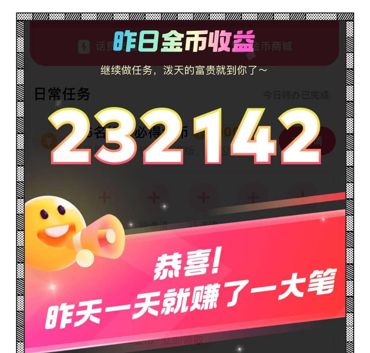 快手极速版和抖音极速版非常像,这种相似不仅体现在赚金币的任务模式上,收益水平也差不多,我现在用快手极速版每天能赚15-25块钱。