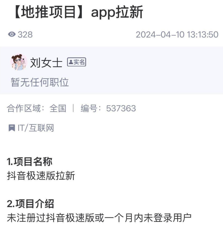 小编从地推接单平台上,查到了抖音极速版新老用户推广活动的相关信息。