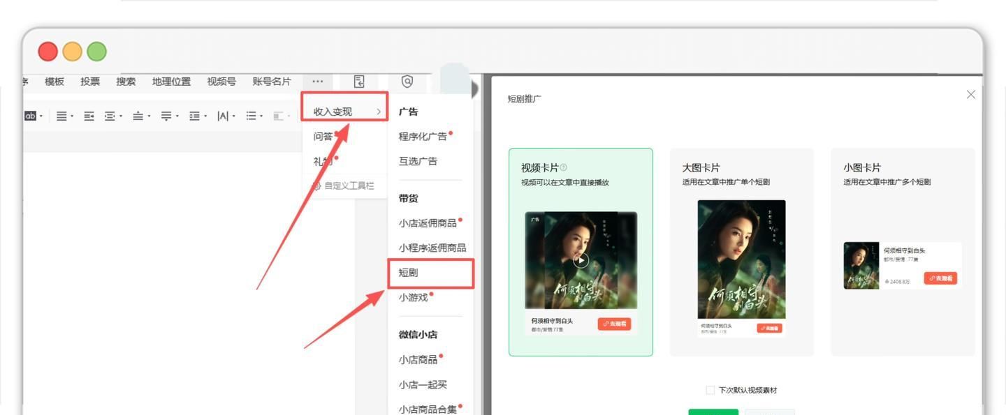 登录公众号后台,点击写新文章,在编辑界面左上角找到更多选项的三个小点 → 选择“收入变现” → 再点击“短剧”,就能看到所有可推广的短剧列表了,你筛选出想推广的剧目,直接挂载到文章里就可以。