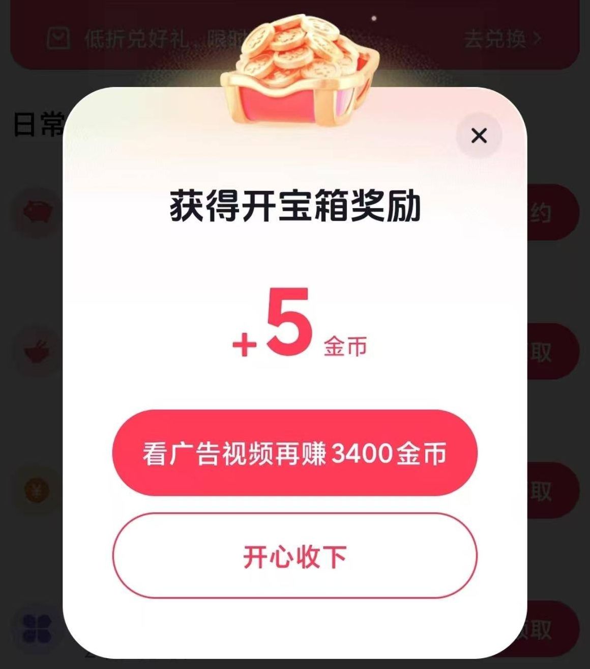 尤其是宝箱广告任务,单条广告最高可获得6600金币,平台金币兑换比例为33000:1,换算下来约2毛钱。虽然达不到“单条5毛”,但收益也算得上可观。