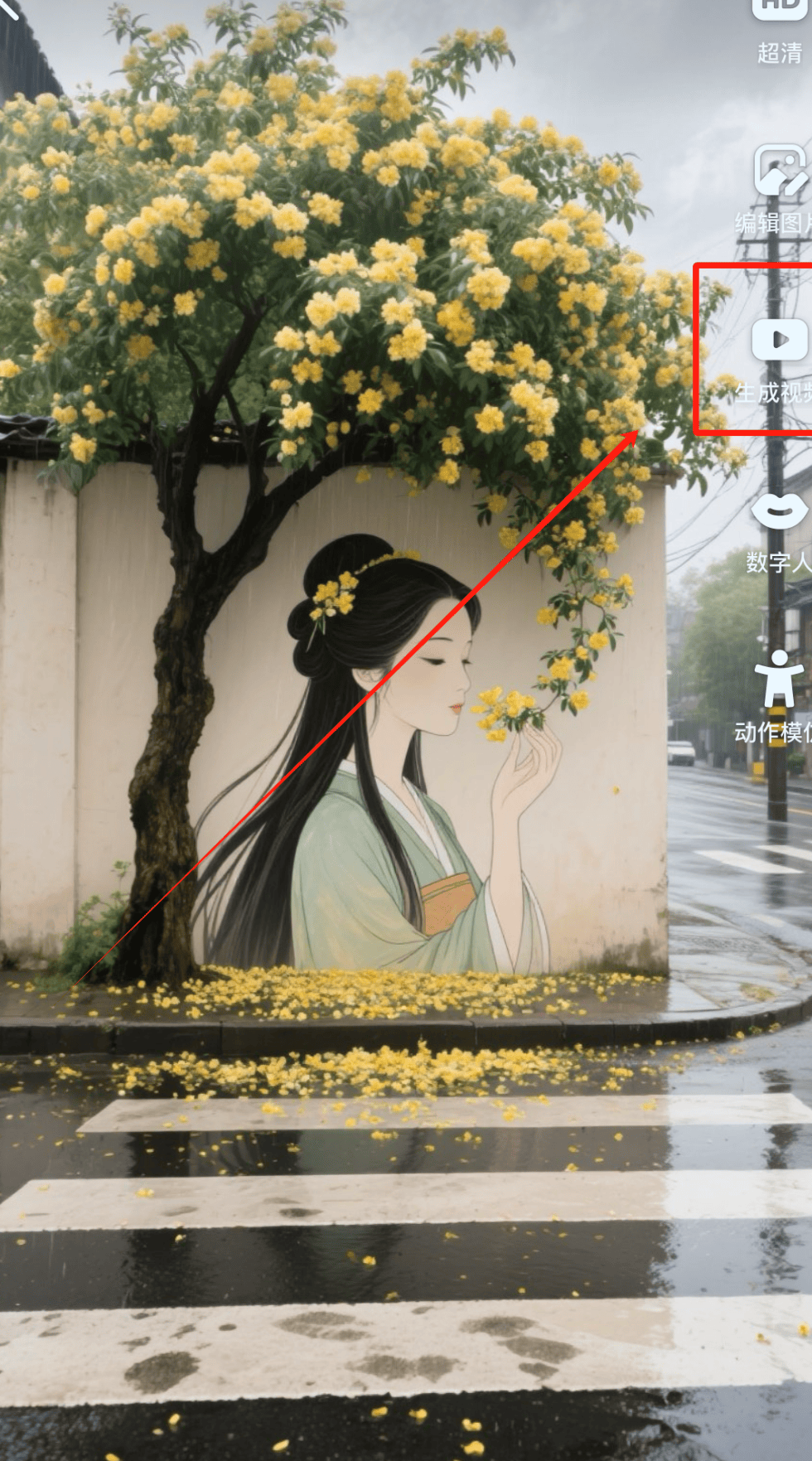 雨后的街道对面,一堵带着岁月痕迹的陈旧矮墙静静伫立,墙上手绘着一幅长发美女的肖像;矮墙外的木香必集客枝桠穿墙垂下,金黄色的小花与美女的长发自然交织缠绕。地面散落着细碎花瓣,远处街景里的电线杆清晰可见,整体呈现超高清远景摄影质感,真实无滤镜,细节拉满。