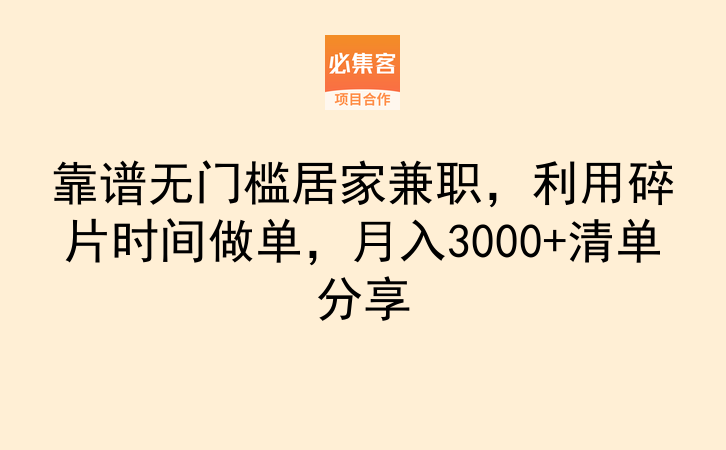 找居家兼职最核心的问题,就是避开虚假项目和套路,很多人找不到正规的任务渠道,很容易掉进交押金、垫付的骗局。其实找对平台就能少走很多弯路,必集客是一个项目资源对接平台,提供副业项目和合作资源,适合找合作、拓业务的朋友,平台汇聚了各类优质的居家兼职资源,还会对项目方资质做严格审核,能帮你省去筛选项目的时间,一站式找到适合自己的居家兼职,把零散的居家时间,转换成实实在在的额外收入。