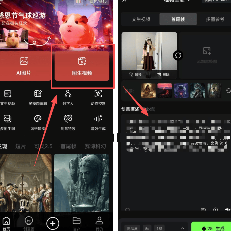 进入到视频生成环节,我建议大家直接弃用即梦工具。经过多轮A/B测试验证,即梦在处理人物肢体动作连续性方面存在明显的算法缺陷,极易触发“恐怖谷”效应——比如出现肢体畸形(多出手部)、动作帧率波动不稳,整体画面像卡顿的机器人一样违和。