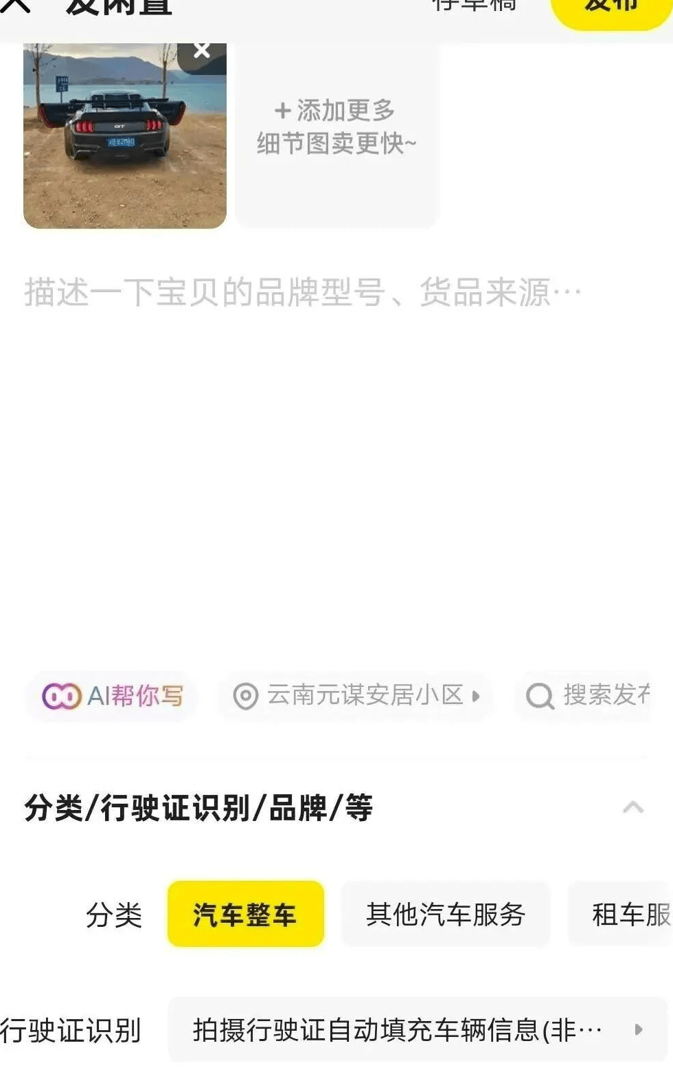 以“闲置车辆”类目为例:发布车牌、二手车等商品,并上传相关图片,就能进入平台预设的车辆信息填写界面。