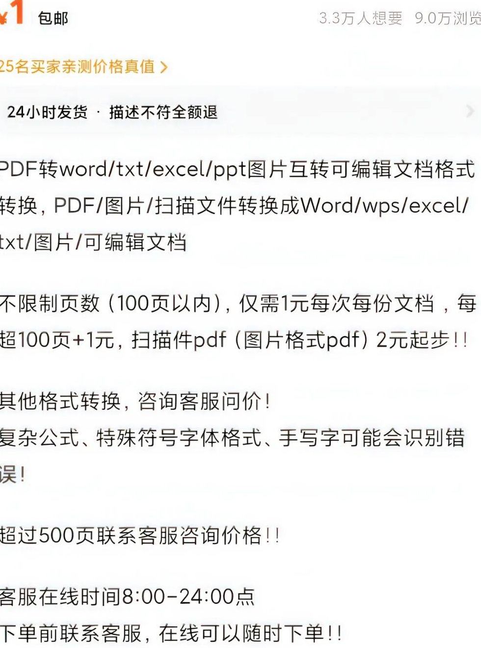 今天来分享一个极易上手的副业项目——帮人转换文件格式。这个项目操作起来有多简单?就像日常用微信发消息一样,点点屏幕就能完成;但别因简单就小看它,不少人靠这个副业,每月都有好几万的稳定收入。看看这个案例:有个账号专门做文档转换服务,一款商品就有3.3万人点击“想要”,浏览量高达9万,成交量也很可观,达6万多单。最近和几个朋友聊天,大家都在讨论副业的事。有人说自己试过不少项目,都没成功,主要是找不到靠谱的信息和指导。这时,有个朋友提到了“必集客”——这是个公众号的名字,她说里面的项目拆解特别详细,还完全免费。她跟着上面的教程学习,试了几个项目,还真有收获。定价也很合理:100页以内收费1元,超出部分每页加收1分钱;这样算下来,至少也赚了三五万。可能有人会疑惑:这么简单的事,为什么还有人花钱请人做?因为现在不少上班族每天都要处理PDF、Word等各类文档,自己研究转换软件太费时间,充值会员动辄几十块钱,不如花点小钱图个方便。还有大学生处理论文格式,也愿意花钱解决——毕竟费用不高,还能节省不少精力。怎么转文档格式呢?不会转换格式的朋友别担心,其实用一款免费转换软件就能快速搞定(转换工具我放在了文末,大家自取)我们打开免费转换软件,点击右上角的三条横线,找到“转Word”功能,上传PDF文件,很快就能转换成可编辑的Word文档或Excel表格。如果要转换其他格式,点击“全部工具”,里面有各类转换工具可用。学会操作工具后,就能去闲鱼接单赚钱了。在闲鱼搜索“pdf转Word”,参考同行的文案,重新编写自己的内容,千万别直接抄袭。搞定文案之后,配图也不难,用美图秀秀参考同行的样式制作就行。这个项目本质上是利用信息差赚钱,关键就看你愿不愿意行动。从操作到接单都很简单,新手花几分钟就能学会;要是连尝试的动力都没有,那就算了,但市场需求确实很大,有空闲时间的朋友不妨试试。好了,以上就是今天的分享。由于篇幅有限,很多操作细节没能讲透,想详细了解这个项目的朋友,可以找我领取免费的文档转换工具。