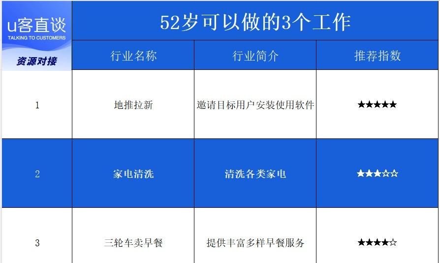 52岁,已然人过半百,有一部分朋友已经步入了享受生活的阶段——手里有积蓄,时间也充裕,正好可以去完成一些心心念念的事。但更多的同龄人,却还在被职场的种种压力裹挟着:家庭的担子仍需要他们继续打工赚钱,可身体却渐渐吃不消那些高强度的工作了。今天这篇文章,就为大家推荐3种适合52岁人群、不用坐班看脸色,还能月入过万的赚钱门路。1:地推拉新地推拉新是一种发展已久的传统营销推广模式,即便在互联网飞速发展的今天,它依然占据着不可替代的重要地位。在你的固有印象里,地推拉新是不是就等同于发传单?那你可把它想得太简单了。如今还有一种热门的地推拉新赚钱方式,那就是——地推app拉新。简单来讲,就是通过线下地面推广的形式,面对面邀请新用户下载安装并使用你推广的APP。据必集客、集客圈、地推贴吧等一手拉新接单平台的数据显示,地推APP拉新的单量佣金基本都在30-50元之间。刚开始做的时候,建议优先选择口碑好、知名度高的软件,比如抖音极速版、快手极速版、小红书等。当然,为了吸引更多目标用户,还可以批发一些3-5元的小礼品,作为用户安装使用APP的激励。要是在大型商超门口做推广,一天邀请10位以上的目标用户并不难,月入过万也能轻松实现。2:家电清洗为了保障日常生活的便捷,电视机、油烟机、冰箱、洗衣机等各类大家电,早已成为每个家庭的必备品,使用频率极高。而要让这些家电维持正常运转,定期清洗是必不可少的,这也让家电清洗服务的需求量持续走高。如果你掌握相关的操作技巧与技能,不妨试试这个单价报酬正不断上涨的赚钱行当。首先要提前准备好必备工具,包括高压水枪、专用清洗剂、防护服等;同时专业培训也必不可少,只有熟练掌握操作规范、保证服务质量,才能积累更多新老客户。等慢慢建立起口碑后,一天洗三四台家电,日收益就能稳定在四五百元左右,这样的赚钱方式何乐而不为呢?3:三轮车卖早餐“一年之计在于春,一日之计在于晨”要想让一天的工作、学习状态在线,一顿扎实的早餐必不可少。如今越来越多的家庭习惯在外购买早餐,省时又省心,这时用一辆三轮车售卖煎饼、包子、饭团等便携早餐,就是个非常合适的选择。虽然需要早起,但只要能保证餐食干净卫生、口感地道,就能慢慢积累起一批稳定的回头客。在售卖过程中,不妨多问问顾客的需求,适当拓展产品品类,这对早餐生意的长久经营百利而无一害。以上就是为大家介绍的3种适合52岁人群、无需坐班的赚钱门路。年龄从来不是赚钱的阻碍,只要找对适合自己的赛道,别说52岁,就算到了62岁,一样能创造可观的收益!