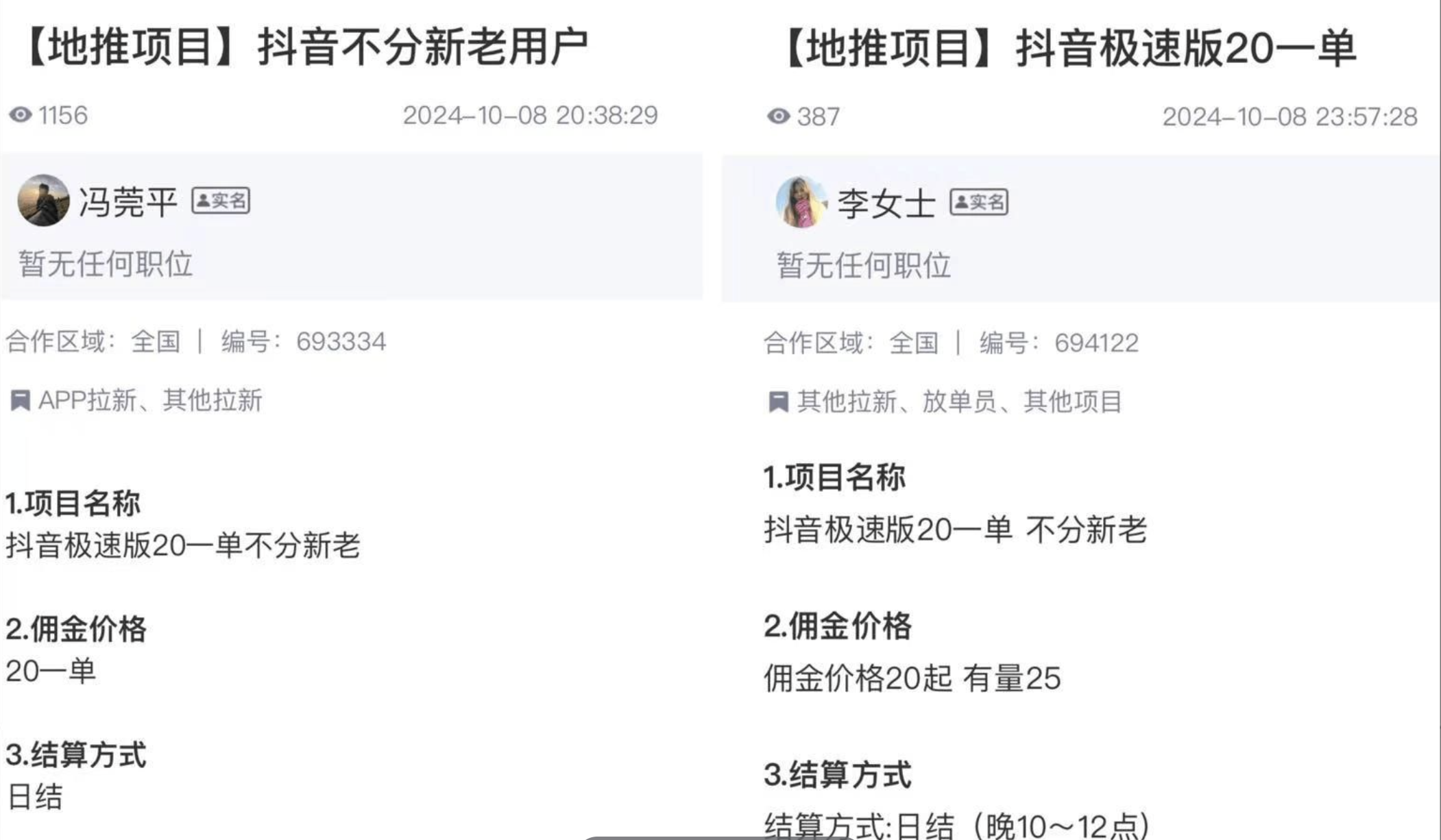 抖音极速版赚钱领现金,这事儿靠谱吗?很多人都知道抖音极速版刷视频看广告能领金币,10000金币可兑换1元。但很少有人清楚,抖音极速版APP实际上是为地推APP拉新量身打造的轻量化应用。因此,从诞生之日起,它就肩负着“赚钱”的核心使命。所以抖音极速版赚钱领现金,是它与生俱来的“使命”!然而,即便如此,绝大多数人在抖音极速版APP上收获寥寥。究其根源,往往是“信息不对称”所致。本期文章,我们将为您揭秘抖音极速版赚钱领现金三个技巧,帮助大家实现抖音极速版的收益最大化。因此,接下来我们分享的内容,你最好一个字都不要遗漏,保证能让你收获少则上千、多则上万的财富。1:抖音极速版app拉新谈及抖音极速版APP拉新,这无疑是公认的最赚钱项目。但遗憾的是,绝大多数人都找不到拉新的入口。想必有人会质疑:“任务后台不是明摆着吗?”正因如此,我才说绝大多数人难以操作。因为抖音极速版任务后台的拉新任务几乎难以完成,其要求是“从未安装过抖音、抖音极速版、抖音火山版等APP的全新用户”。即便是专业的地推工作人员,也往往难以找到这样的纯新增用户。实际上,真正面向地面推广员的抖音极速版APP拉新项目,只需寻找未下载过抖音极速版APP的有效用户。那么,如何找到这样的项目呢?答案其实很简单,只需在U客、闲创等APP拉新推广的一手接单平台上,寻找渠道方的授权即可。从图片中的相关信息不难看出,单是抖音极速版APP的拉新佣金就颇为可观,通常在20-25元之间。2:抖音极速版好友助力除了APP拉新外,抖音极速版的好友助力同样是个收益颇丰的项目。而且,这一项目无需接单,直接在抖音极速版的任务页面就能操作,即“邀请1人得30元”的任务。然而,这一任务也需掌握一定技巧。如果不懂得方法,收益可能也平平;但若掌握窍门,每天都能额外领取数万金币。其实,这一任务暗含着激励机制:每日邀请一位30天未登录过的好友,除了获得18.8元外,还能额外获得5元奖励。因此,在邀请目标群体时,切勿一次性邀请完,正确的做法是每日邀请一人,这样每天都能多赚5万金币,也就是五块钱。3:抖音极速版刷视频看广告抖音极速版的广告任务,掌握技巧的人每个视频广告能获得3400金币,而没有掌握技巧的人则可能仅获得18金币。如果您想成为前者,建议您仔细阅读以下内容。抖音极速版的视频广告主要分为电商广告、直播广告和游戏广告。其中,游戏广告最为简单,而电商广告则相对耗费时间。因此,这里不再赘述电商广告的养机技巧。对于直播广告,通常是游戏直播。若您刷到此类广告,切勿给主播刷礼物,因为完全没必要。但您一定要观看满两分钟,并进行互动评论。这样,过一段时间后,您的金币额度便会有所提升。至于游戏广告,如果您刷到了,那么恭喜您,很快就能养成领取3400金币的习惯。通常,一个宝箱会开出4个视频。假如其中有2个视频是同一款游戏,建议您安装并试玩一下。单日累计游戏在线时长达到2小时,您很快就能享受到每个视频3400金币的待遇。当然,如果您觉得游戏在线时间太长,也可以选择首充走捷径。但请注意,首充玩法并不建议一开始就尝试,因为还未赚钱就先花钱,这是副业赚钱的大忌。以上便是我根据个人经验总结的抖音极速版赚钱领现金攻略,希望对您有所帮助。如果您是大学生,希望我的这套方法论,可以让你的大学生涯过得更滋润一些。