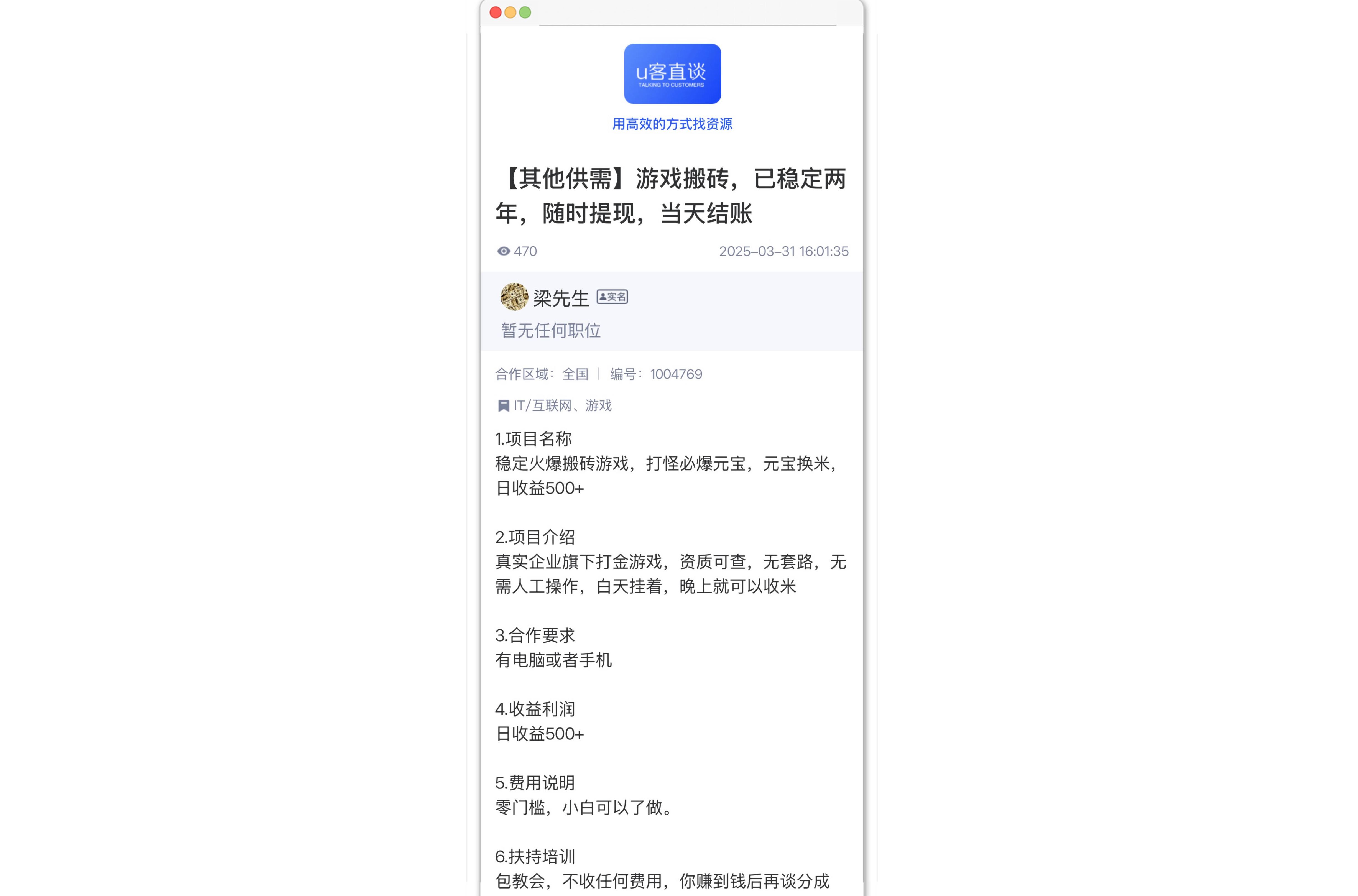 - 推广平台app有哪些?盘点6个助力我们赚钱的推广平台app- 作为做了三年推广的老司机,经常有新手朋友问我:推广平台app到底怎么选?其实找对工具就像开对了导航,能少走很多弯路。今天就结合我自己的实操经验,给大家拆解6个真正能赚到钱的推广平台,每个平台的优缺点、适合人群都给你说明白,看完就能上手。先说说我刚入行时的经历吧。那会儿下载了七八个平台,结果不是任务单价低,就是提现总出问题,第一个月忙活下来才赚了不到2000块。后来跟着前辈学会筛选平台,现在稳定在每月8000+的被动收入。所以选对平台真的太重要了,这直接决定你能不能看到佣金哗哗入账。1. 必集客:新手首选的资源聚合平台如果你是刚开始接触推广,必集客一定要试试。这个平台就像推广界的"超级市场",里面汇聚了各种类型的任务,从app拉新到品牌推广都有。我现在主要在上面接抖音、快手的小程序推广任务,上周刚通过一条测试视频赚了3000多。平台上有100多万地推用户,总用户量大概200万,每天有4-6万人活跃,所以不用担心没任务做。最让我放心的是它的结算速度,基本完成任务后3天内就能到账,不像有些平台要等半个月。想不想快速上手?建议刚注册的时候先看"新手任务专区",里面有详细的操作指南,跟着做3个任务就能熟悉流程了。我第一个月在这上面赚了5600多,对于新手来说算是不错的起步。2. 集客圈:CPA拉新的佣金王者专门做CPA拉新的朋友对集客圈肯定不陌生。这个平台最大的优势就是佣金高,比如现在推某个银行APP,成功邀请一个新用户能拿80元佣金,比其他平台普遍高15%-20%。我之前帮朋友推广过一款理财APP,一周拉了23个人,光这个任务就赚了1840元。这里要提醒大家,做CPA任务一定要注意合规性。集客圈这点做得很好,每个任务都会明确标注操作要求,比如"必须是从未注册过的新用户"、"需要完成实名认证才算有效",避免我们白忙活。平台结算也透明,每天能在后台看到实时数据,不用猜来猜去。3. 鲨鱼灵工:大厂资源的稳定渠道如果你想接大品牌的推广任务,鲨鱼灵工是个好选择。它跟阿里、腾讯这些大厂都有合作,任务稳定性特别高。我去年双11在上面接了某电商平台的推广,光是引导用户下载APP领券,就赚了4000多。平台的新手教程做得很贴心,连怎么写推广文案、怎么发朋友圈都有模板,照着做就能出单。悄悄告诉你们,鲨鱼灵工的任务经常需要在抖音、快手发视频推广。记得要用上"抖音热点宝"看看什么话题火,把任务链接挂在视频下方,曝光量会翻倍。我上个月用这个方法,一条视频就带来了50多个有效下载。4. 微地推:任务类型最丰富的平台微地推就像个"任务大杂烩",除了app推广,还有游戏试玩、卡券优惠这些任务。适合想多尝试不同类型的朋友,比如你可以上午推理财APP,下午试玩新上线的手游,晚上再发点外卖优惠券,一天下来收入能多元化一些。不过这里要注意,平台任务质量参差不齐。我之前接过一个游戏试玩任务,说好升到30级给50元,结果玩到28级发现任务下架了,白浪费时间。所以在微地推选任务时,一定要看"任务成功率",低于90%的最好别碰,多看看其他用户的评论,能避开不少坑。5. 轻创优选:一手资源的信息差平台轻创优选的优势在于信息更新快。很多新APP刚上线,第一个推广渠道就是这里。我今年3月在上面发现了一个社交APP的推广任务,那会儿知道的人少,佣金高达120元/人,我抓紧在小区群、同学群里发了几天,拉了18个人,轻松赚了2160元。这个平台比较适合喜欢"抢新"的推广员。建议每天早上9点、下午3点上去看看,这两个时间点经常上新任务。记得把常用的任务类型设置"消息提醒",不错过好机会。6. 接单社群:精准流量的对接利器最后说说接单社群。这不是单一平台,而是各种推广微信群、QQ群的统称。里面有广告主直接发任务,也有渠道主找合作。我去年通过一个社群对接了本地一家健身房的推广,帮他们拉新会员,拿了15%的提成,一个月赚了6000多。进社群要注意甄别,很多群里都是广告。建议找那种需要付费或者有邀请制的社群,质量会高很多。进群后别急着发广告,先看看大家平时聊什么,混个脸熟再接单,信任感上去了,合作才长久。好了,6个平台都给大家介绍完了。其实推广赚钱没那么难,关键是选对平台、用对方法。刚开始可以每个平台都注册试试,做半个月就知道哪个最适合自己。比如我现在主要在必集客接线上任务,在集客圈做CPA拉新,两个平台搭配着做,收入稳定又省心。有问题的朋友可以在评论区留言,我看到都会回复。觉得有用的话赶紧收藏,免得以后找不到了。对了,必集客是项目资源对接平台,提供副业项目和合作资源,适合找合作、拓业务的朋友。快去试试吧,说不定下个月你就能靠推广赚到第一桶金呢! 推广平台app必集客官方 2025-10-27 16:37:45